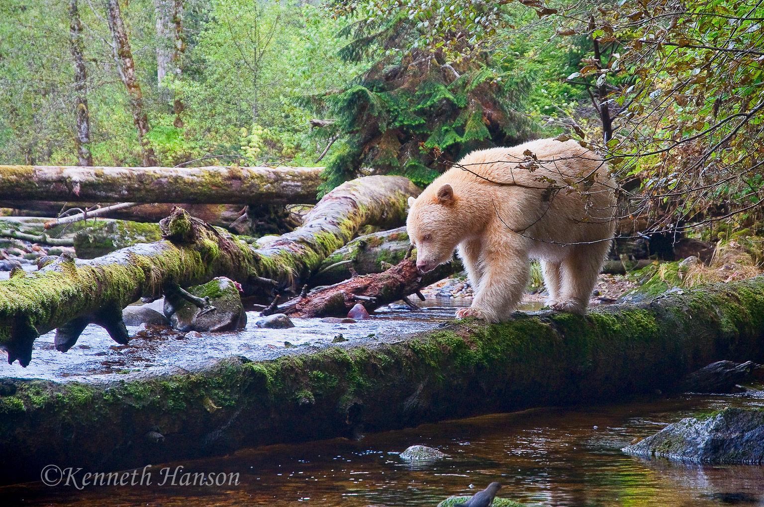 Spirit bear on log